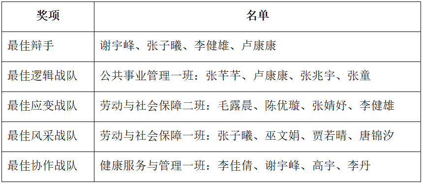 经由各班辅导员助理与观众代表共同投票,评选出各轮辩论赛的优胜团队及最佳辩手,获奖情况如下:
