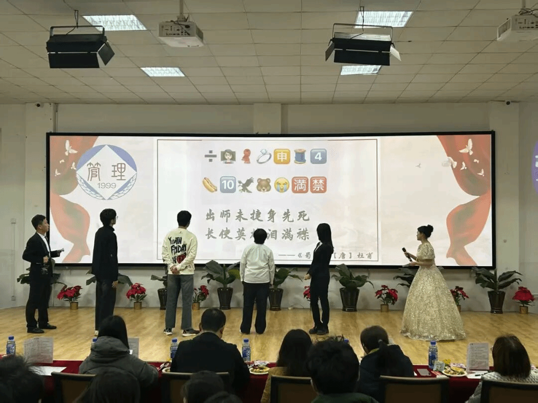 文艺展演间隙,互动游戏《我有emoji你有诗》点燃全场,新生们争相竞猜诗句,在欢笑中感受汉字魅力。