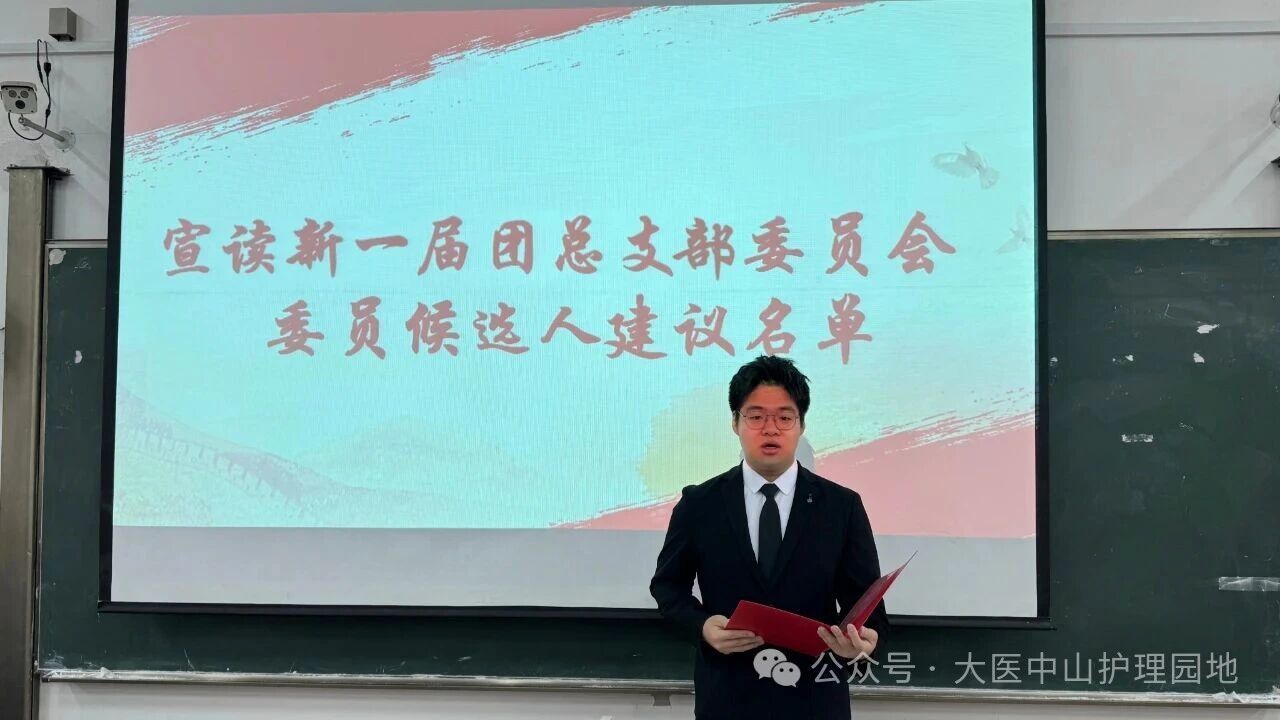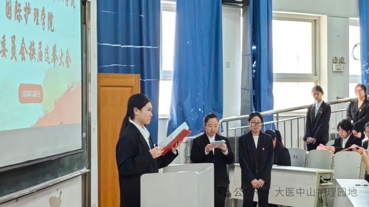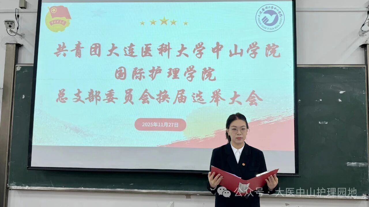 青春汇聚,使命在肩。为进一步加强共青团组织建设,充分发挥团组织的桥梁和纽带作用,2025年11月27日11:30,共青团大连医科大学中山学院国际护理学院总支部委员会换届选举大会于实验楼八阶梯隆重召开。国际护理学院副院长兼党支部书记陈丽娜老师、国际护理学院团总支书记兼2024级辅导员李媛冰老师、2025级辅导员赵芷巍老师、2022级辅导员宋晓卉老师、2023级辅导员马馨蕾老师出席本次大会,学院各团支部共281名共青团员参会,本次会议由国际护理学院团总支副书记杨紫晴同学主持。