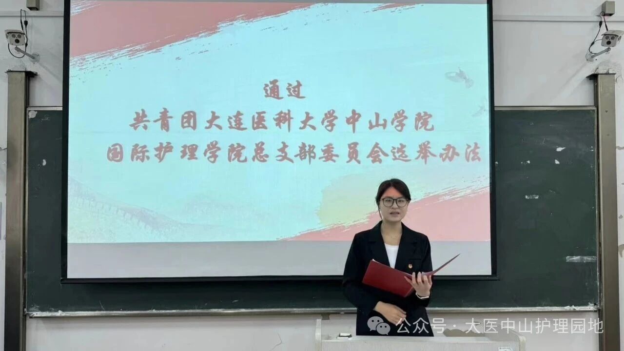 随后,大会进入选举相关事项审议环节。首先,国际护理学院团总支副书记吕欣欣宣读《共青团大连医科大学中山学院国际护理学院总支部委员会委员选举办法(草案)》,全体团员认真审议后,以举手表决方式一致通过该选举办法。