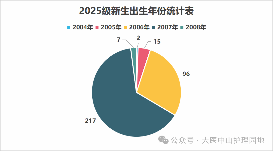 年龄有差,求知心同!国际护理学院2025级新生出生年份“版图”来啦!2008年7人、2007年217人、2006年96人、2005年15人、2004年2人,最大年龄差为4岁。