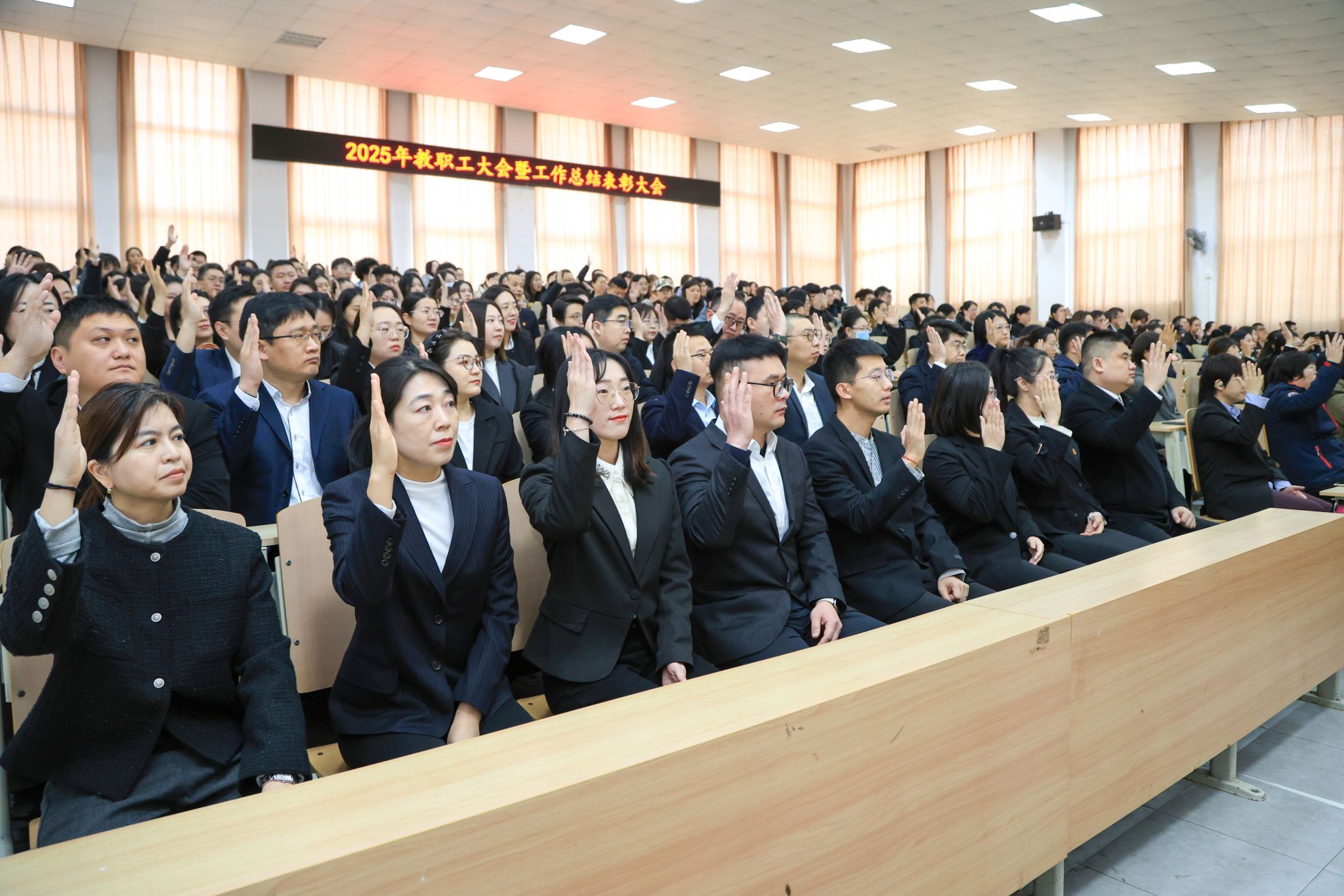 大会在庄严的国歌声中拉开帷幕。院长兼党总支书记钟凤宏作题为《聚力攻坚结硕果 乘势奋进再建功》的工作报告。报告聚焦党建引领、人才培养、内涵建设等11个方面,全面总结学校2025年发展建设实绩,统筹擘画2026年重点工作蓝图。他强调,2026年是“十五五”规划开局之年,开好局、起好步意义重大、责任非凡。全体教职工是学校发展的中坚力量,更是推动目标落地的核心支撑。新的一年,要秉持初心、勇毅前行,以实干强根基、以奋进提质效,凝心聚力走好开局之路,携手共创学校高质量发展的美好未来。工作报告经全体教职工审议表决通过。