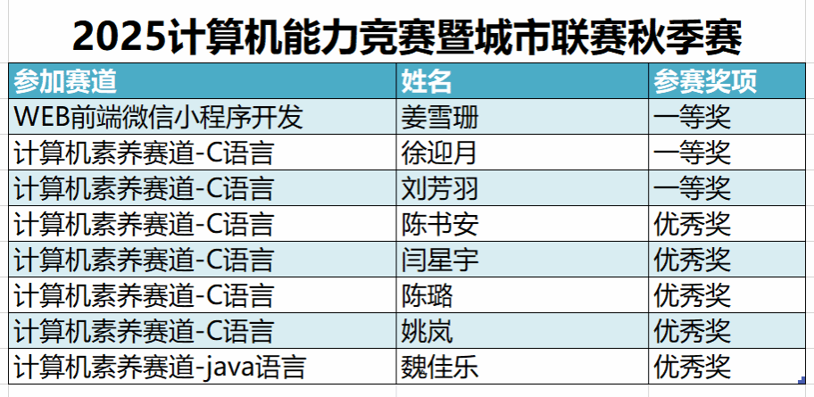 近日,由大连市计算机学会、苏州市计算机学会、天津市计算机学会联合主办的2025年计算机能力竞赛暨城市联赛秋季赛圆满落幕。我院学子在大赛中发挥出色,获得一等奖3项,优秀奖5项。本次竞赛...