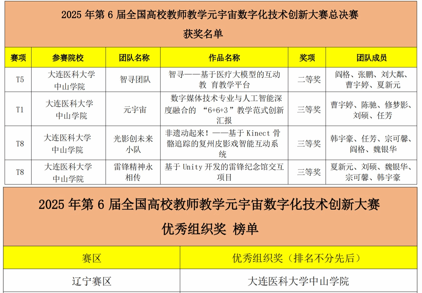 11-21/2025我校教师在第6届全国高校教师教学元宇宙数字化技术创新大赛中喜获佳绩近日,2025第6届全国高校教师教学元宇宙数字化技术创新大赛总决赛圆满收官。我校教师凭借深厚教学功底与新颖数智化融合方案崭露头角,一举斩获4项荣誉——二等奖1项、三等奖3项,学校更因出色的赛事组织与统筹支持,获评“优秀组织奖”,全方位彰显了我校在元宇宙、人工智能等数字化技术与教育教学深度融合领域的探索成效与育人硬实力。学校高度重视此次赛事,参赛教师紧扣大赛主题,立足医学教育特色与专业教学实际,深耕数字化教学创新。... -