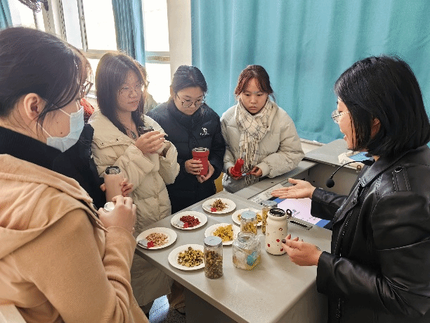 课堂打破传统讲授模式,以“药食同源”为核心,特别设置“菊花花茶品鉴”环节,同学们一边观察不同品种菊花的色泽、风味差异,一边对照《中国药典》标准,分组探讨不同菊花的药用价值、品质鉴别要点。从“性状鉴别”的专业维度分析花瓣形态、气味特征,到结合重阳“采菊饮露、养生延年”的传统习俗解读文化内涵,同学们在“看、闻、品、议”中,不仅扎实掌握了中药鉴别理论,更深刻理解了“课堂所学即生活所用”的道理——这份对理论知识的深度理解,正是支撑他们在本次敬老活动中从容讲解、精准服务的核心底气。