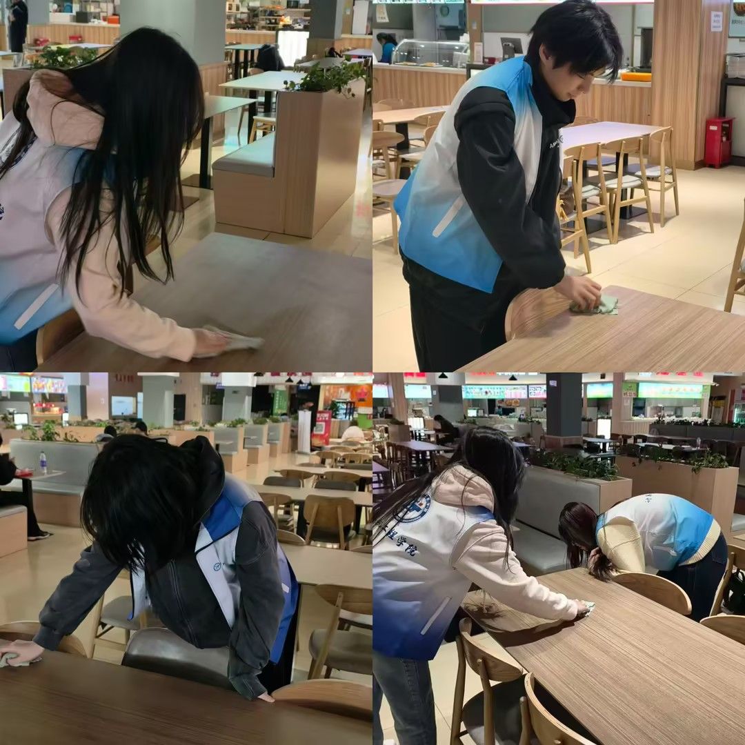 大家分工协作、默契配合,有的负责擦拭餐桌椅、清理桌面污渍,有的认真清扫地面垃圾、规整餐具摆放,有的协助工作人员整理食材区域、维护就餐秩序。尽管任务繁琐,但同学们毫无怨言,以认真细致的态度对待每一个环节,用实际行动践行服务他人、奉献校园的宗旨。