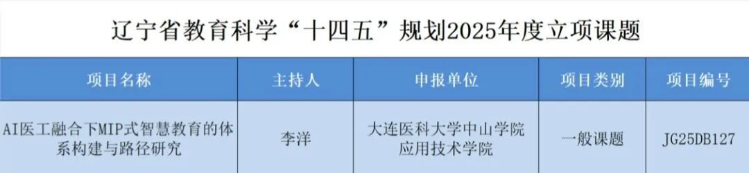 近日,从《关于批准辽宁省教育科学“十四五”规划2025年度立项课题的通知》获悉,经专家评审、社会公示并报辽宁省教育科学规划领导小组批准,我院医学影像技术教研室教师李洋主持申报的《AI医工融合下MIP式智慧教育的体系构建与路径研究》研究项目获批辽宁省教育科学“十四五”规划2025年度立项课题。