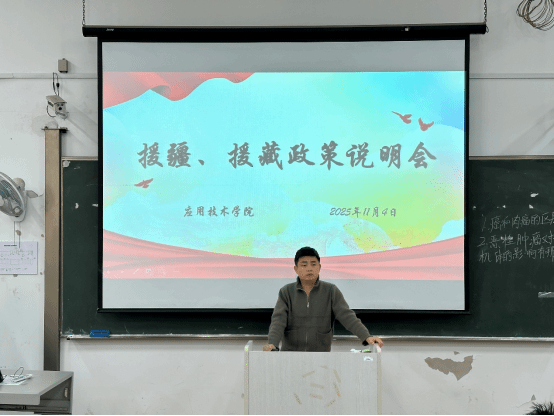 为帮助我院学子深入了解国家援疆援藏工作重大意义,拓宽就业视野与人生格局,应用技术学院于2025年11月4日在实验楼8阶梯教室成功举办了援疆援藏工作政策宣讲会。本次宣讲会由辅导员郭宇剑主讲,2023级全体同学参与。