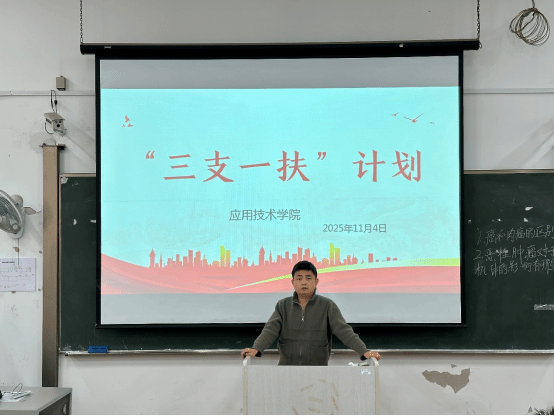 为帮助我院学子深入了解国家基层就业项目,拓宽职业发展视野,做好未来职业规划,应用技术学院于2025年11月4日在实验楼8阶梯教室成功举办了“三支一扶”计划政策宣讲会。本次宣讲会由学院辅导员郭宇剑主讲,2023级全体同学参与。