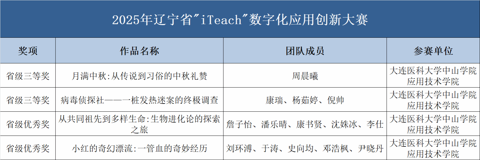 近日,由辽宁省教育厅主办、渤海大学承办的2025年“iTeach”辽宁省大学生数字化教育应用创新大赛圆满落幕。在本届大赛中,我院学子与来自全省各高校的优秀队伍同台竞技、交流学习,最终喜获省级三等奖2项、优秀奖2项。